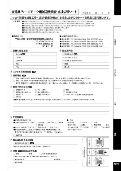 付録索引オプション技術資料減速機/サーボモータ用減速機調査・点検依頼シートご記入日年月日ニッセイ製品を当社工場へ返却・調査依頼される場合、必ずこのシートを現品に添付願います。注意事項■依頼シートが同梱されていない場合または内容が不足している場合、調査・点検できませんのでご注意願います。■プーリ・スプロケット等の付属品・冶具等が取り付いた状態の製品は、調査・点検ができませんのでご注意願います。■製品が古い場合またはお客様にて改造・分解された製品については、調査・点検ができませんのでご注意願います。■弊社出荷後3年以上経過している製品は調査・点検の費用が発生します。■製品のご返却前にご購入窓口へご連絡をお願いいたします。■製品の発送に関わる費用はお客様のご負担となります。■製品送付先〒444-1222愛知県安城市和泉町大海古6-3TEL〈0566〉91-3510ニッセイ安城南工場3F受付宛■営業所(お問合せ先)●東京営業所TEL03〉5695-5411FAX〈03〉5695-5418●大阪営業所TEL06〉6210-1157FAX〈06〉6210-2507●中部営業所TEL0566〉92-7410FAX〈0566〉92-7418●海外営業課TEL0566〉92-5312FAX〈0566〉92-7002①製品の返却主様・会社名必須・ご住所・ご担当者・TEL・FAX③ニッセイ営業担当者必須④返却理由必須②返却品内容・返却品型式必須・モータメーカ/型式・製造番号(銘板MFGNo)・数量・購入先□点検外観上の状況、運転確認(製品の分解は致しません)。受付後、稼働日にて7日間ほどを目途に点検を行います。□調査不具合箇所、その原因調査の報告(必要に応じて分解致します。分解後の再組付けはできません。)受付後、稼働日にて14日間ほどを目途に調査を行います。場合によっては、部品メーカーの調査となりお時間がかかるケースがございます。⑤製品不具合症状必須□初期動作不良□使用中に動かなくなった□異音がする□その他()詳細内容の記載(いつ・どこで・何が・どうなったなど)□グリース漏れ□停止位置がばらつく□起動トルクが大きい□破損□寸法・取付け不良□ドライバアラーム(過負荷・過電流・位置ずれ)詳細な記載をしていただければ、より短期間での回答が可能になります。1279モータ部上水平モータ部下モータ据付方向●その他・回転方向運転サイクル・・モータ据付方向(下図より選択してください)□一方向□連続□モータ部上□正逆□断続(頻度回/分)□水平□モータ部下⑥ご使用状況●ご使用の用途は何ですか●ご使用期間はどのくらいですか□1ヵ月以内□1年以内□3年未満□3年以上()□使用している□使用してない●インバータは使用していますか●弊社出荷後3年以上経過している製品は調査・点検費用が発生します。費用が発生する場合、調査を希望しますか□希望する□希望しない□詳細内容⑦報告書に関するご要望・報告書の宛名会社名必須急ぎの調査が必要な場合は、営業担当者にご連絡ください。⑧点検・調査後の製品の処置□修理□廃棄□点検・調査報告後検討※廃棄にチェックされた場合、報告書提出後に製品は廃棄させていただきます。・送付先会社名・送付先住所担当者名