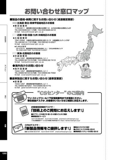 技術資料オプション索引付録お問い合わせ窓口マップ■製品の価格・納期に関するお問い合わせ(減速機営業部)北海道・東北・関東甲信越地区のお客様●東京営業所〒103-0011東京都中央区日本橋大伝馬町1-8ACN日本橋大伝馬町ビル2FTEL〈03〉5695-5411(代表)FAX〈03〉5695-5418E-mailtokyo@nissei-gtr.co.jp近畿・中国・四国・九州・沖縄地区のお客様●大阪営業所〒541-0052大阪府大阪市中央区安土町2-3-13大阪国際ビルディング6FTEL〈06〉6210-1157(代表)FAX〈06〉6210-2507E-mailosaka@nissei-gtr.co.jp●九州出張所〒812-0016福岡県福岡市博多区博多駅南1-3-1日本生命博多南ビル7FTEL〈092〉409-7385FAX〈06〉6210-2507東海・北陸地区のお客様●中部営業所〒444-1297愛知県安城市和泉町井ノ上1-1TEL〈0566〉92-7410(代表)FAX〈0566〉92-7418E-mailhonbu@nissei-gtr.co.jp●海外向けのお問い合わせ●海外営業課〒444-1297愛知県安城市和泉町井ノ上1-1TEL〈0566〉92-5312(代表)FAX〈0566〉92-7002E-mailoversea@nissei-gtr.co.jp■歯車製品に関するお問い合わせ(歯車営業部)●営業課〒444-1297愛知県安城市和泉町井ノ上1-1TEL〈0566〉92-5251FAX〈0566〉92-4770E-mailgearsale@nissei-gtr.co.jp“CSセンター”のご案内CSンターのご案内ワン・ストップコール!!下記電話番号までお電話ください。専任担当デスクが、お客様のいろいろなご相談にお応えします。お客様技術相談デスクで…「技術上のご質問にお応えします!」■ギアモータの選び方・使い方・お困りごとのご相談■機種選定サービスtel:0120-889-867fax:0120-316-565email:tech-cs@nissei-gtr.co.jp※Web機種選定サービスは24時間ご利用可能です。https://sentei.nissei-gtr.co.jp/CRMデスクで…「新製品情報をご提供します!」直通tel:0566-92-5797fax:0120-814-447email:cs@nissei-gtr.co.jp■製品カタログのご請求■eDMについてのお問い合わせ■情報発信システムへのお問い合わせ1282